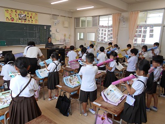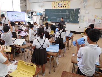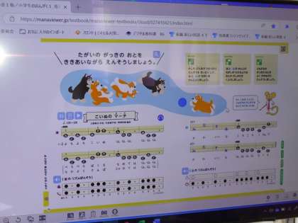 「たがいの がっきの おとを ききあいながら えんそうしましょう」。 けんばんハーモニカの練習です。吹き口を肩から回して口にくわえると、けんばんが見えにくいのでたいへんです。