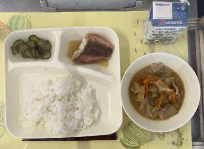 今日の献立は、あかうおのしょうゆだれかけ、豚汁、きゅうりのゆず風味、ごはん、牛乳です。