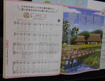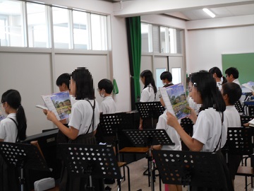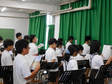 6年生の2学級合同の音楽です。「ふるさと」を各パートにも分けての合唱です。