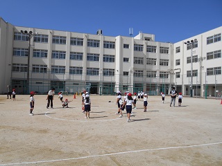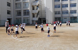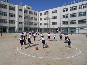 運動場の円の外からボールを転がして、中にいる人はボールから逃げています。