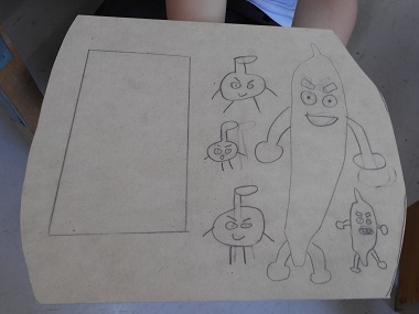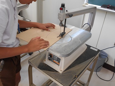下書きした木の板を電動糸のこで線にそって切っていきます。手を切らないよう慎重に作業する必要があります。