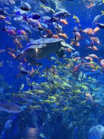 大きな水槽で泳ぐ魚たち、まるで海の中にいるような気持ちになります。
