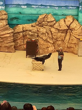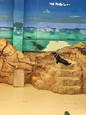 調教師の方の指示をアシカはよくきいて、輪っかをくぐったり、台上にきちんと座ってごほうびのえさをもらったりしています。