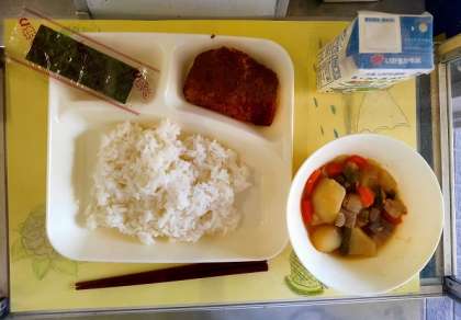 今日の献立は、みそカツ、じゃがいもと野菜の煮もの、焼きのり、ごはん、牛乳です。