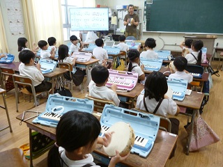 手拍子でリズムをとってから、打楽器とけんばんハーモニカで練習しています。
