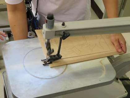 電動糸のこ盤で形に合わせて切った後、みがいて色を付けています。