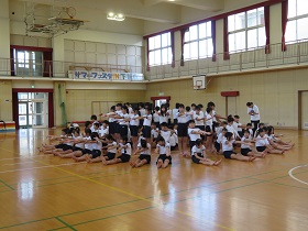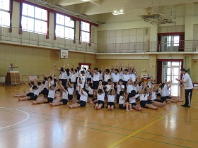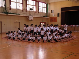 講堂で、運動会の組体操のフラワーの体形練習をしています。