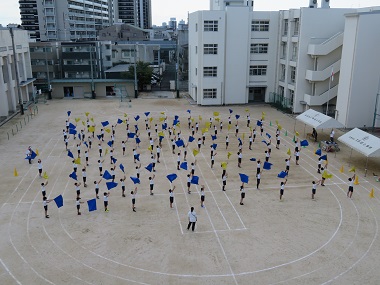 運動場でフラッグやウエーブなどの練習をしています。