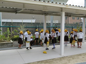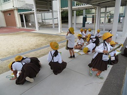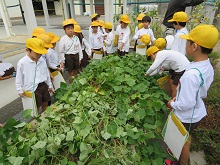 学習園に行って、もうすぐ収穫する「さつまいも」の葉や茎の観察をしています。さつまいもほりが楽しみですね。
