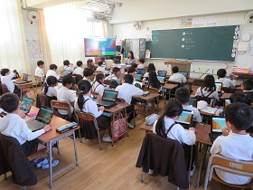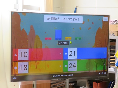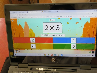 九九の学習で、「Kahoot!(カフート)」のアプリを使った復習をしています。10秒以内に自分の児童用パソコンで答えるようにしています。