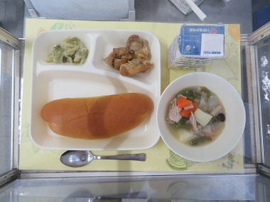 今日の献立は、鶏肉のカレー風味焼き、スープ煮、野菜のソテー、パンプキンパン、牛乳です。