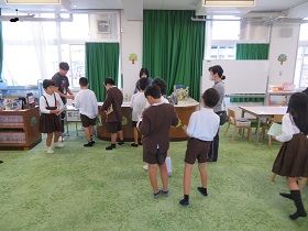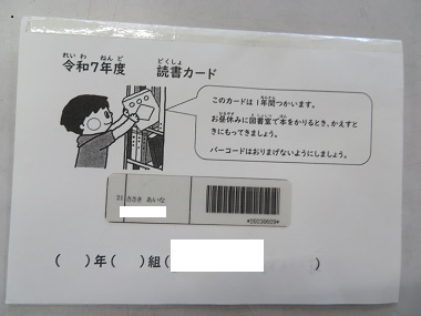 今日借りる本を選んで貸し出しの手続きをしてもらっています。「読書カード」にハンコを押してもらいます。
