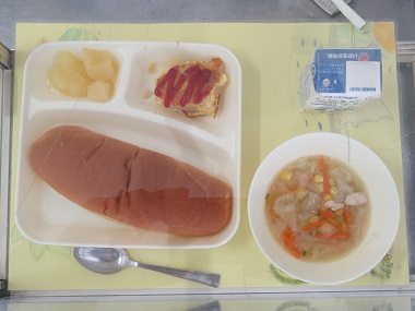 今日の献立は、ツナポテトオムレツ(ケチャップ)、スープ、洋なし(カット缶)、黒糖パン、牛乳です。
