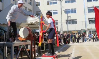 「おわりのたいそう」の後、得点が発表され、今年は赤組が優勝しました。優勝旗・準優勝盾授与、参加賞授与、児童代表のことば、校長先生のお話があり、令和7年度の運動会が終了しました。