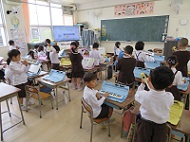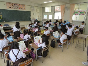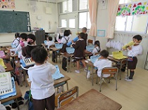 2組の教室では、鍵盤ハーモニカ担当の児童が集まって練習しています。この後は、1年全員集まって練習します。