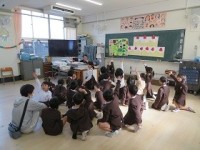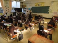 1年1組教室には、打楽器担当の児童が集まって練習しています。