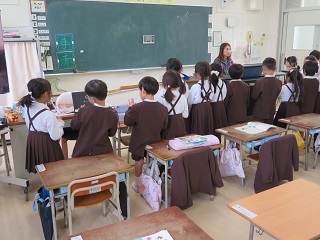 1年1組教室には、打楽器担当の児童が集まって練習しています。