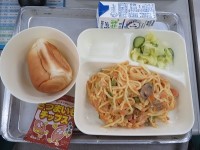 今日の献立は、ウインナーときのこの和風スパゲッティ(きざみのり)、焼きツナキャベツ、固形チーズ、ミニコッペパン、牛乳です。
