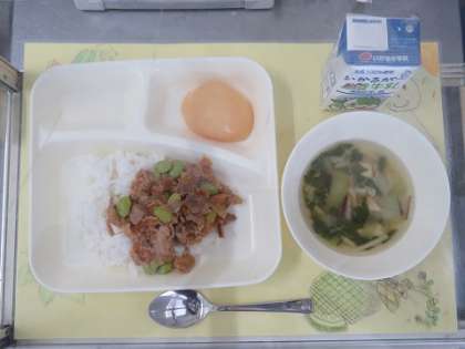 今日の献立は、ピリ辛丼、中華スープ、白桃(缶)、ごはん、牛乳です。