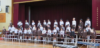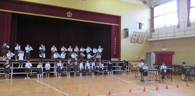 今日は全学年講堂を使って音楽発表会の練習をしました。1年生も舞台に並んで練習しました。