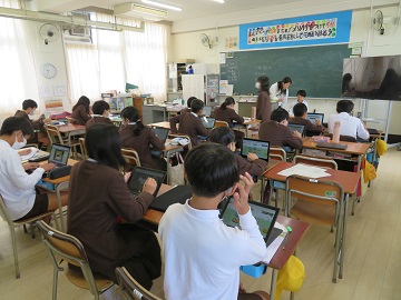 学習端末で算数の復習問題をしています。終わって「コグトレ」に取り組んでいる人もいます。