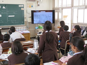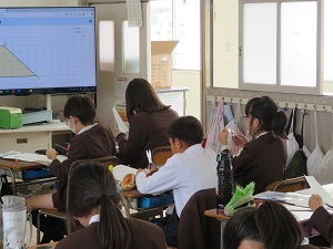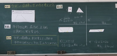 「台形の面積の求めかたを考えよう」。今までに習った四角形や三角形の面積の求め方を使って、台形の面積の求め方を考えました。台形をはさみで切って、ノートに貼って、面積を求める式を考えました。いくつかの考え方を黒板に書いて発表しました。