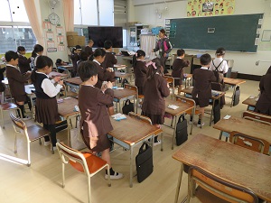 ひきざんの計算カードの練習をしています。終わった人からいすにすわります。