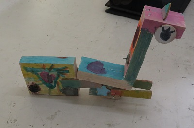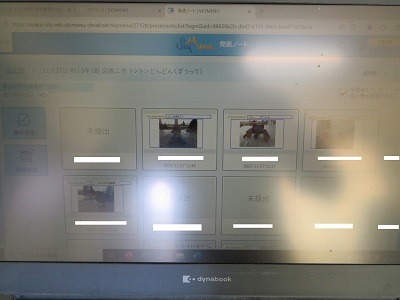 くぎを使って組み立てた木工作品です。完成した作品を児童端末で撮影してテーマとともに発表ノートに入れています。