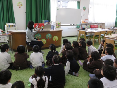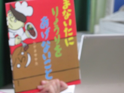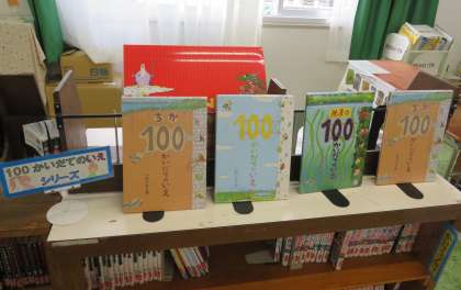 読み聞かせは「まないたに りょうりを あげないこと」でした。上に置かれた食べ物を食べてしまうレストランのまないたについての面白いお話です。また、図書室には「100かいだてのいえシリーズ」の本が並べられていました。