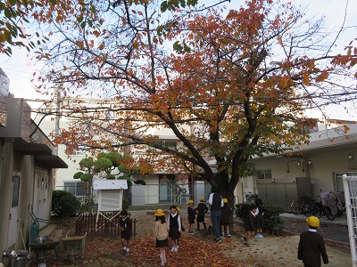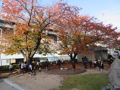 1時間目に正門横で落ち葉集めをしました。きれいに色づいた落ち葉を拾い集めました。これを使って生活科の秋のおもちゃづくりをしました。