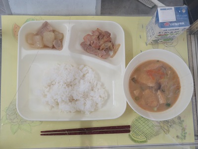 今日の献立は、鶏肉の甘辛焼き、みそ汁、だいこんの煮もの、ごはん、牛乳です。