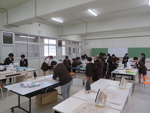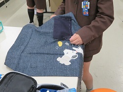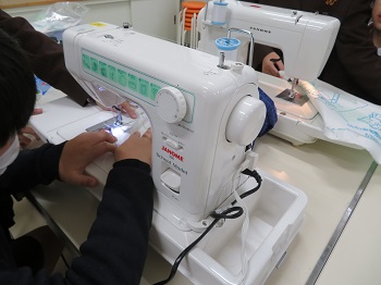 「エプロンづくり」をしています。ミシンで縫ってポケットをつけます。