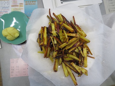 学級園で育てたさつまいもを使って、「いもけんぴ」「茶きんしぼり」を自分たちの手でつくりました。ポップコーンも作りました。みんなおいしく食べました。