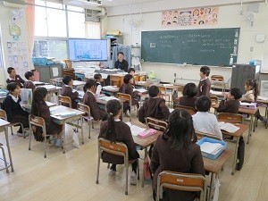「やまびこごっこ」。立っている児童の呼びかけに、みんながやまびこを返します。