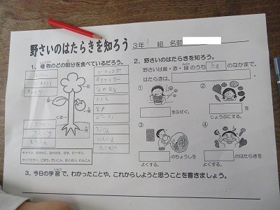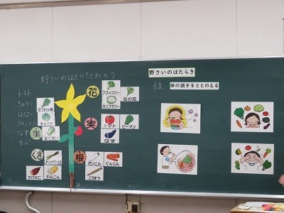 「野さいのはたらきを知ろう」。野菜のどの部分を食べているか、からだに対してどんな働きをしているか学習しました。