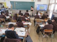 2時間目にC-NETのエイ リク先生に授業をしていただきました。班に分かれて、カードを選び、カードの裏の点数を競うゲームです。