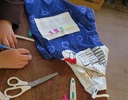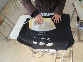 「エプロン」の製作の仕上げをしています。休みなどで遅れていた児童に2人の先生がついています。