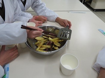 1時間目2時間目の2時間を使って「おいもパーティー」をしました。学習園で収穫したさつまいもを切ってホットプレートで焼いて、甘いたれをつけています。無事できあがっておいしく食べています。
