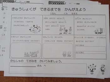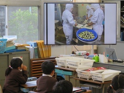2時間目は栄養教諭の先生が食育をしました。「きゅうしょくが できるまでを かんがえよう」をテーマに給食室の調理風景の画像も見ながら学習しました。