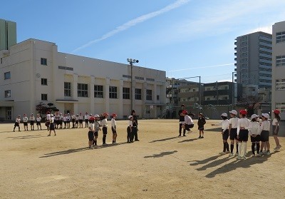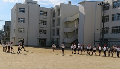 個人とびの後、大なわとびをしています。今日はお日様の日ざしがあたたかく感じます。