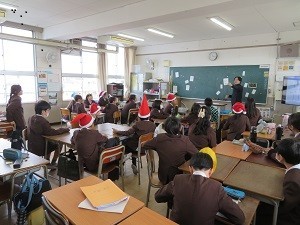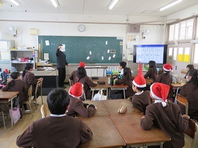 黒板に裏向けてはられたカードをグループごとに選んで、裏に書かれた点数で合計点を争っています。