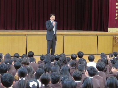 校歌を歌った後、校長先生のお話がありました。午年(うまどし)の馬は仲間と一緒に力強く進む動物です。1年間のまとめと新学年に向けての準備をする3学期、友だちと仲良く、目標をしっかりもって、学校生活を送ってほしいとのお話がありました。