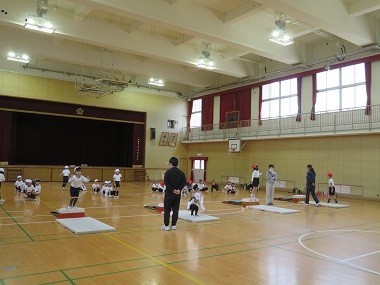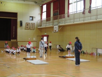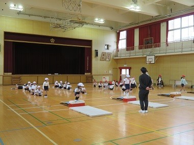 跳び箱運動です。最初は、ジャンプして跳び箱に乗って慣れるための運動をしています。