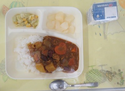 今日の献立は、豚肉と金時豆のカレーライス、サワーソテー、和なし(カット缶)です。