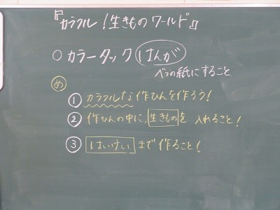 「カラフル!生きものワールド」。版画の下書きをしています。「生きもの」を入れて背景も書いてカラフルな作品になるように考えています。