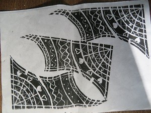 彫刻刀で彫った板を複数組み合わせて版画にします。1枚目の板を彫っています。