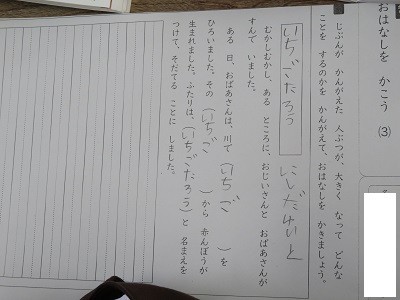 「おはなしをかこう」。自分が考えた人物が大きくなってどんなことをするのかを考えて書いています。