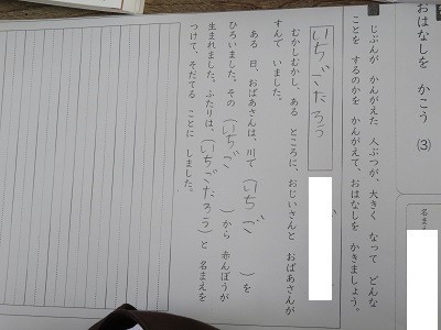 「おはなしをかこう」。自分が考えた人物が大きくなってどんなことをするのかを考えて書いています。