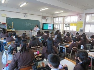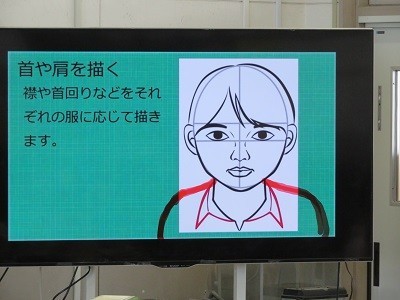 児童用端末で自分の顔を写してそれを見ながら自分の顔を描きました。カーボン紙を引いて版画の下書きをして、彫っていきます。
