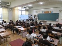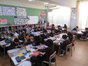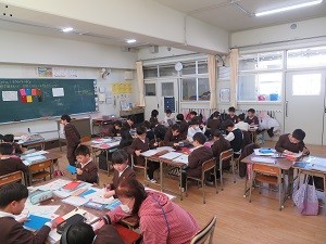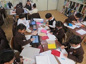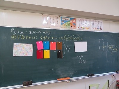 「カラフル!生きものワールド」。下絵をもとに台紙を切ってうまく並べて「生きものワールド」をつくります。